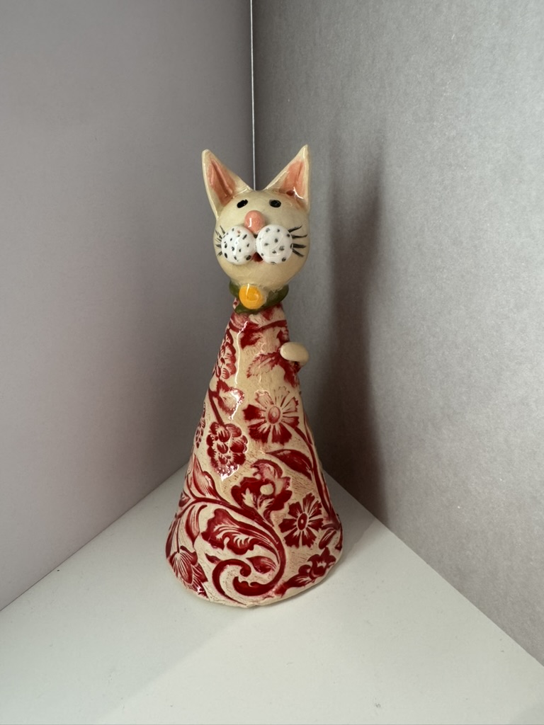 Eine elegante Keramik-Katze mit rotem floralen Mustern auf hellem Grund. Die Figur wirkt zugleich verspielt und ruhig und ist ein echtes Unikat. Ideal als Geschenk oder dekoratives Highlight im Wohnbereich.