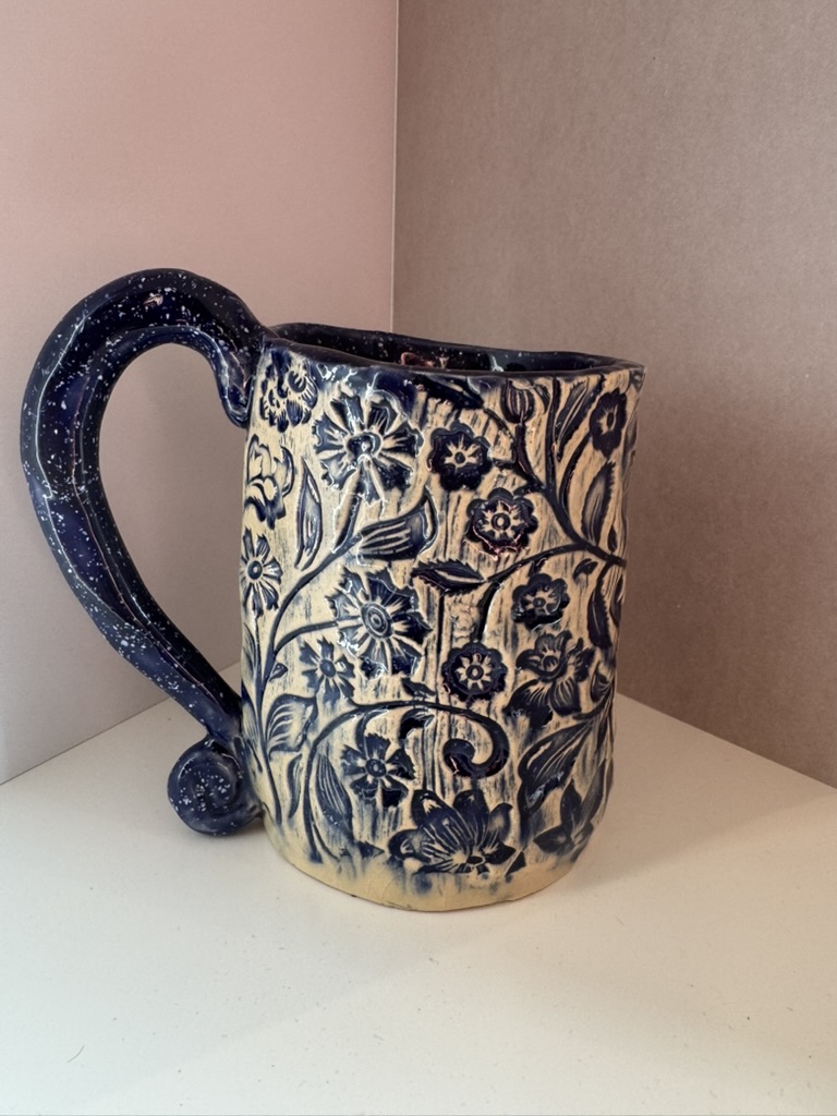 Diese handgefertigte Keramiktasse überzeugt durch ihr fein ausgearbeitetes, florales Relief und die ruhige Farbkombination aus Naturton und tiefem Blau. Das eingearbeitete Blumen- und Rankenmuster verleiht der Tasse eine besondere Tiefe und macht jede Seite zu einem kleinen Blickfang. Der geschwungene Henkel liegt angenehm in der Hand und sorgt für ein gutes Trinkgefühl. Durch die handwerkliche Fertigung ist jede Tasse ein Unikat, leichte Unterschiede in Farbe und Struktur sind gewollt und unterstreichen ihren individuellen Charme. Ob für den ersten Kaffee am Morgen oder eine gemütliche Teepause – diese Tasse verbindet Funktionalität mit handwerklicher Ästhetik und eignet sich sowohl als Geschenk als auch als stilvolle Ergänzung für den eigenen Tisch.