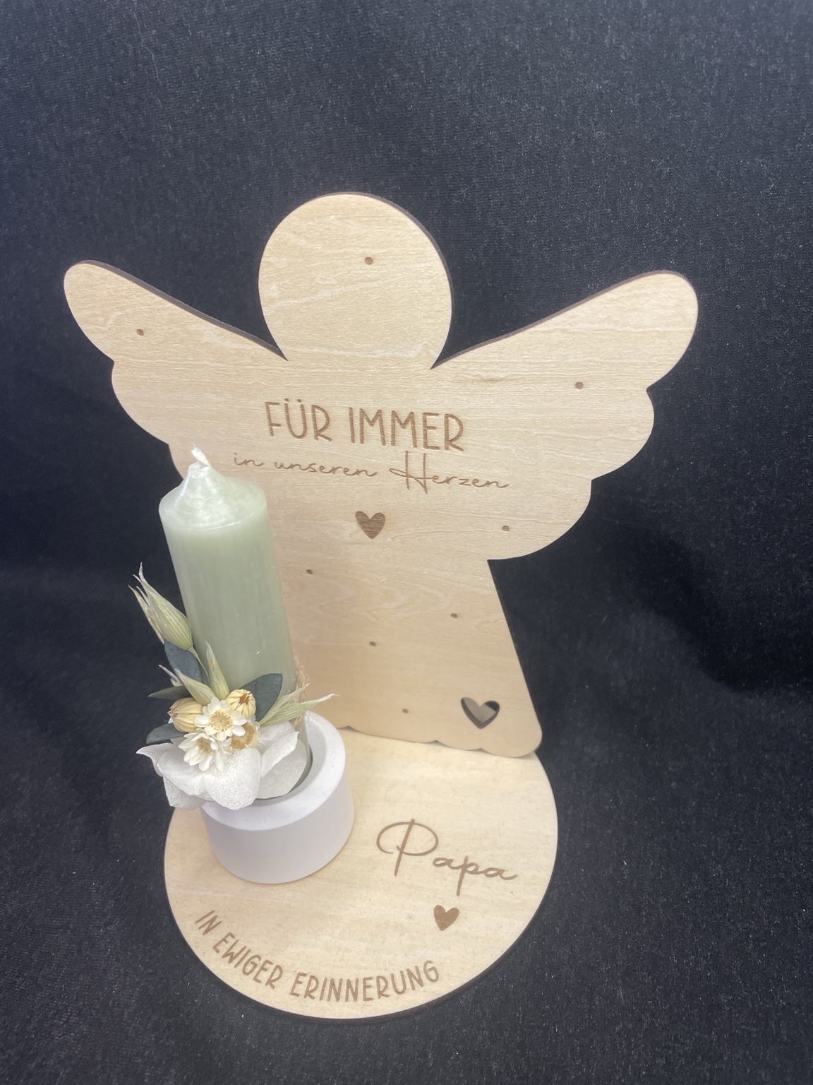 Die natürliche Holzstruktur, die filigrane Gravur und die handdekorierten Trockenblumen machen jedes Stück zu einem einzigartigen Unikat. Als Tischdekoration, kleines Erinnerungslicht oder persönliches Geschenk bringt der Schutzengel eine warme und beruhigende Atmosphäre in jedes Zuhause.