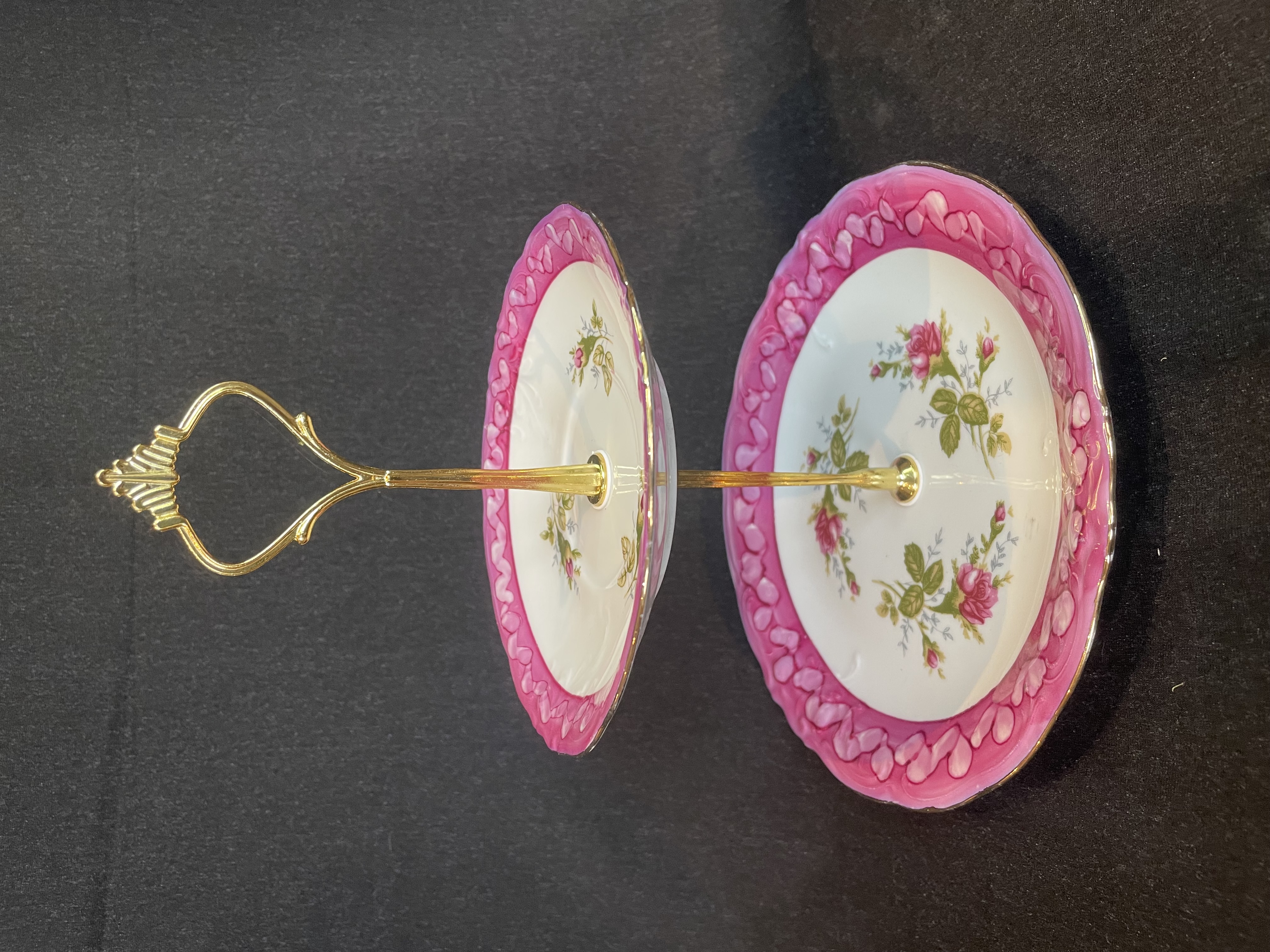 Diese zweistöckige Etagere wurde aus einem gebrauchten Sammeltassenset neu gestaltet und zu einem auffälligen Vintage-Unikat umgebaut.