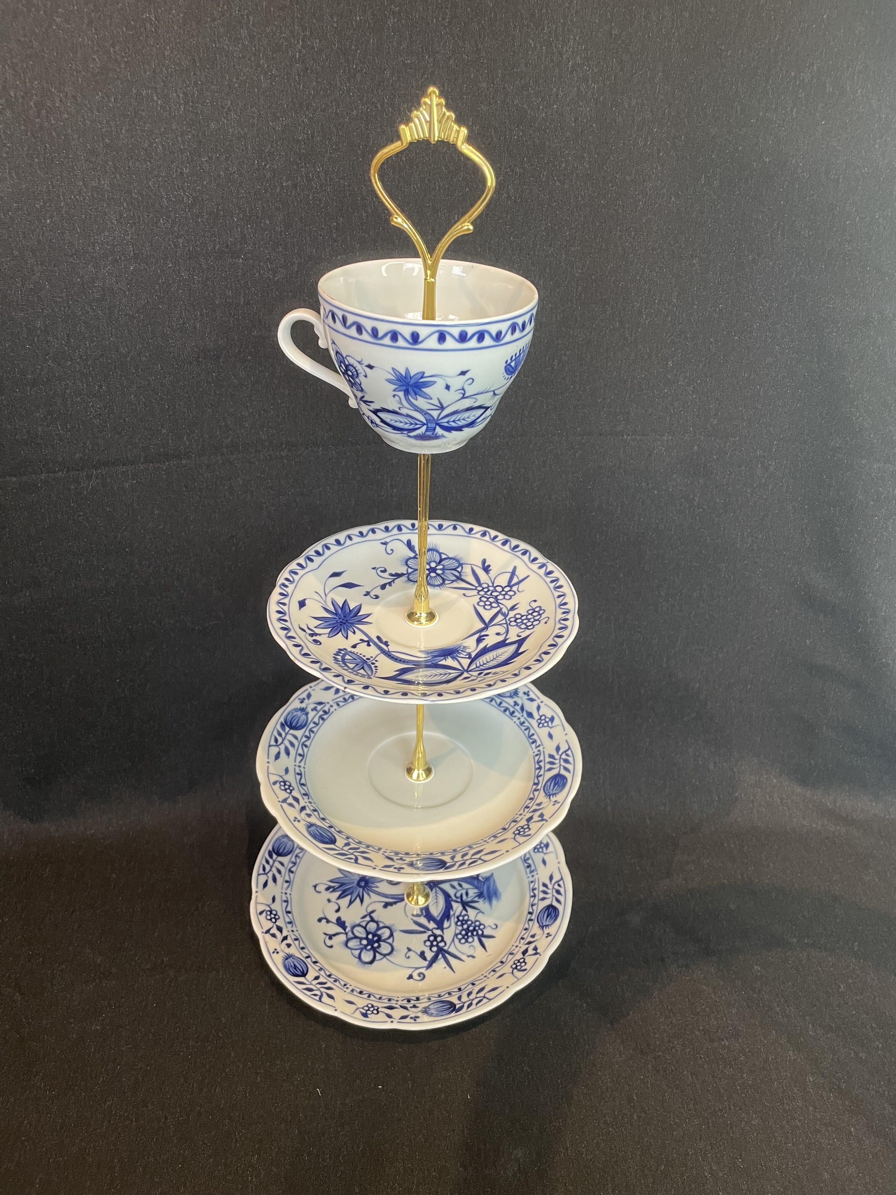 Diese dreistöckige Etagere wurde aus einem gebrauchten Sammeltassenset im klassischen Zwiebelmuster neu gestaltet und zu einem stilvollen Unikat umgebaut.