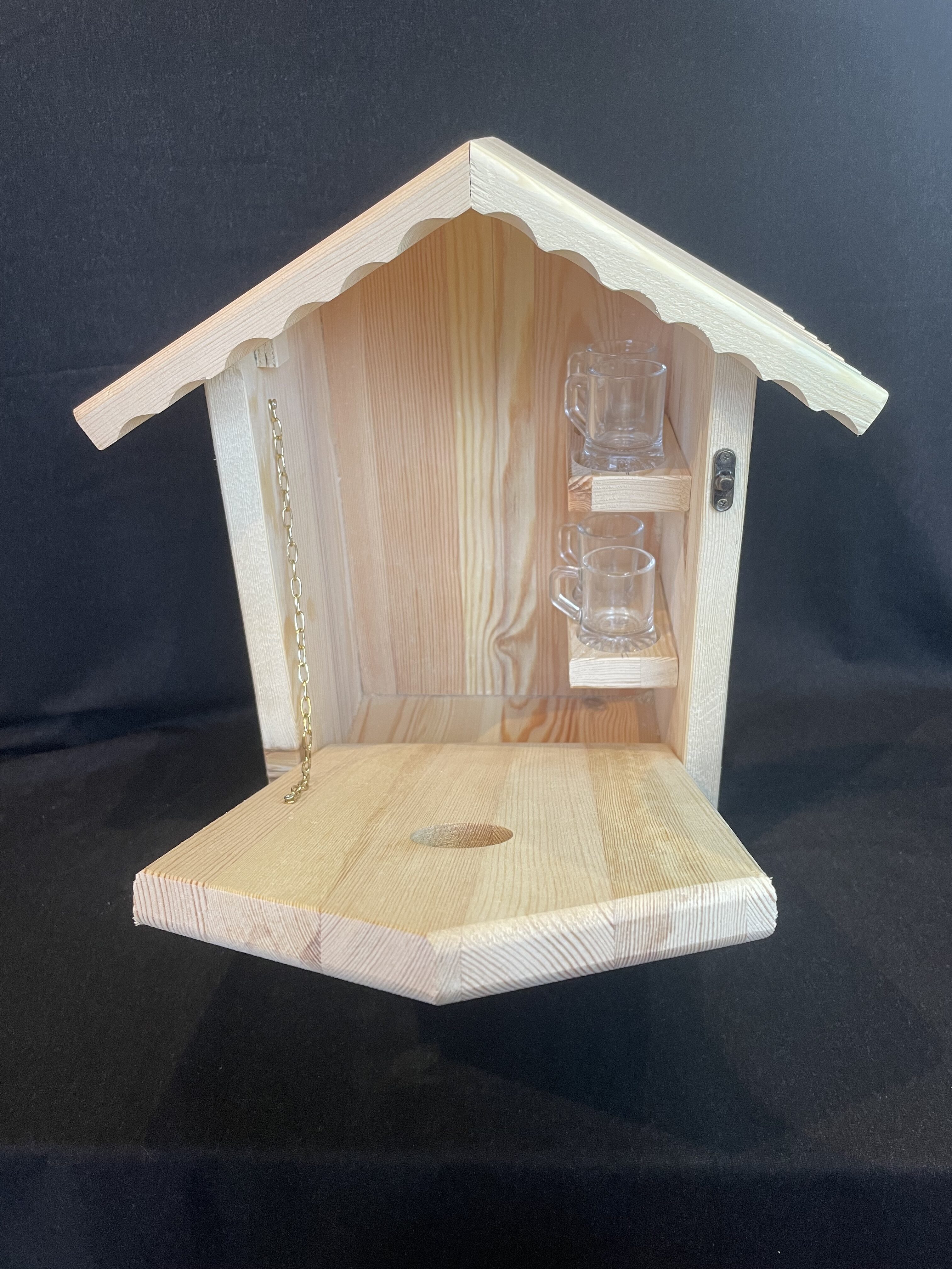 Gefertigt aus massivem Holz und liebevoll gestaltet, verbirgt sich hinter der dekorativen Front ein kleiner Stauraum mit integrierten Shotgläsern. Die seitliche Tür lässt sich öffnen und wird mit einem Metallverschluss gesichert. Innen befinden sich Halterungen für die Gläser – diese sind bereits im Lieferumfang enthalten.